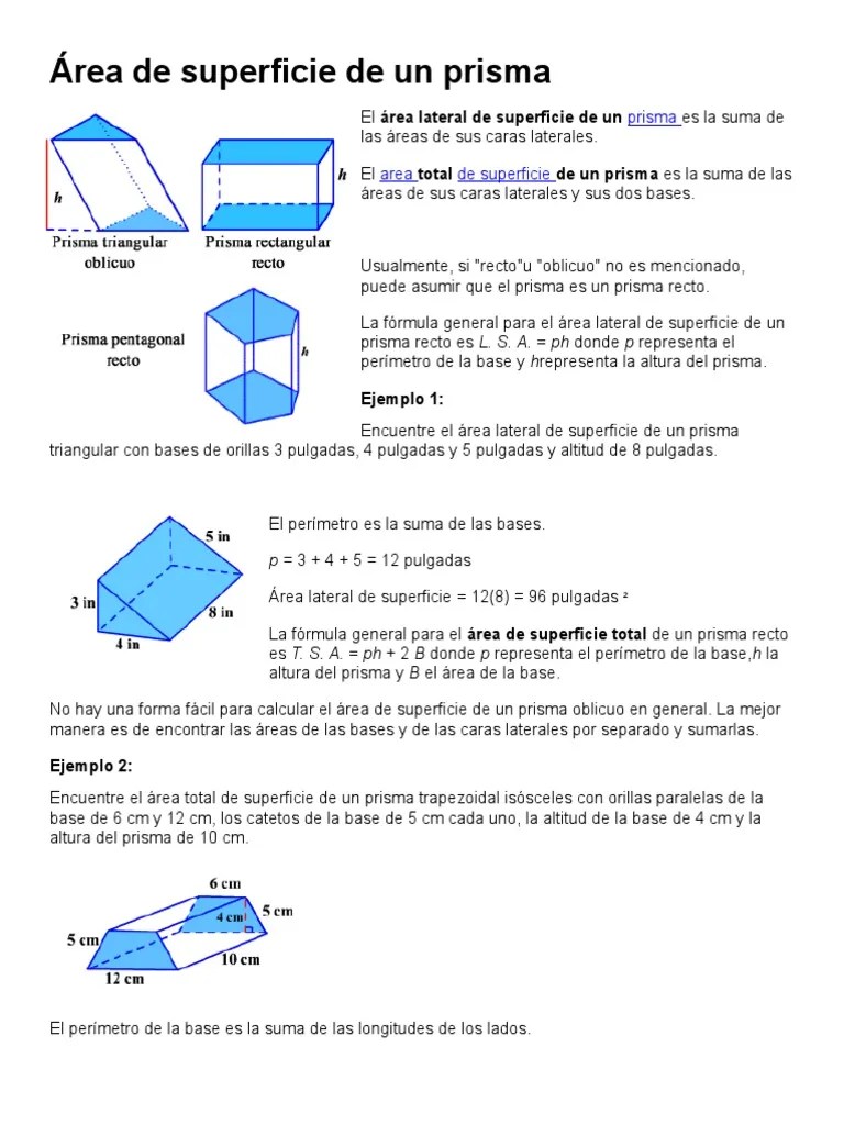 Luego, divide este valor por la mitad. Matemática para todos, desde cero, padres de familia, tutores y maestros 1) full vídeos de matemática . Sus caras laterales son rectángulos iguales. Encuentre el área lateral de superficie de un prisma triangular con bases de. ¿cuál es el área de superficie de este prisma triangular? ¿cómo calcular el área de un prisma triangular? · at = área total. Un prisma es un poliedro que consta de . La fórmula general para el área lateral de superficie de un prisma recto es l. La fórmula general para el área de superficie total de un prisma recto es . Multiplica la base por la altura.